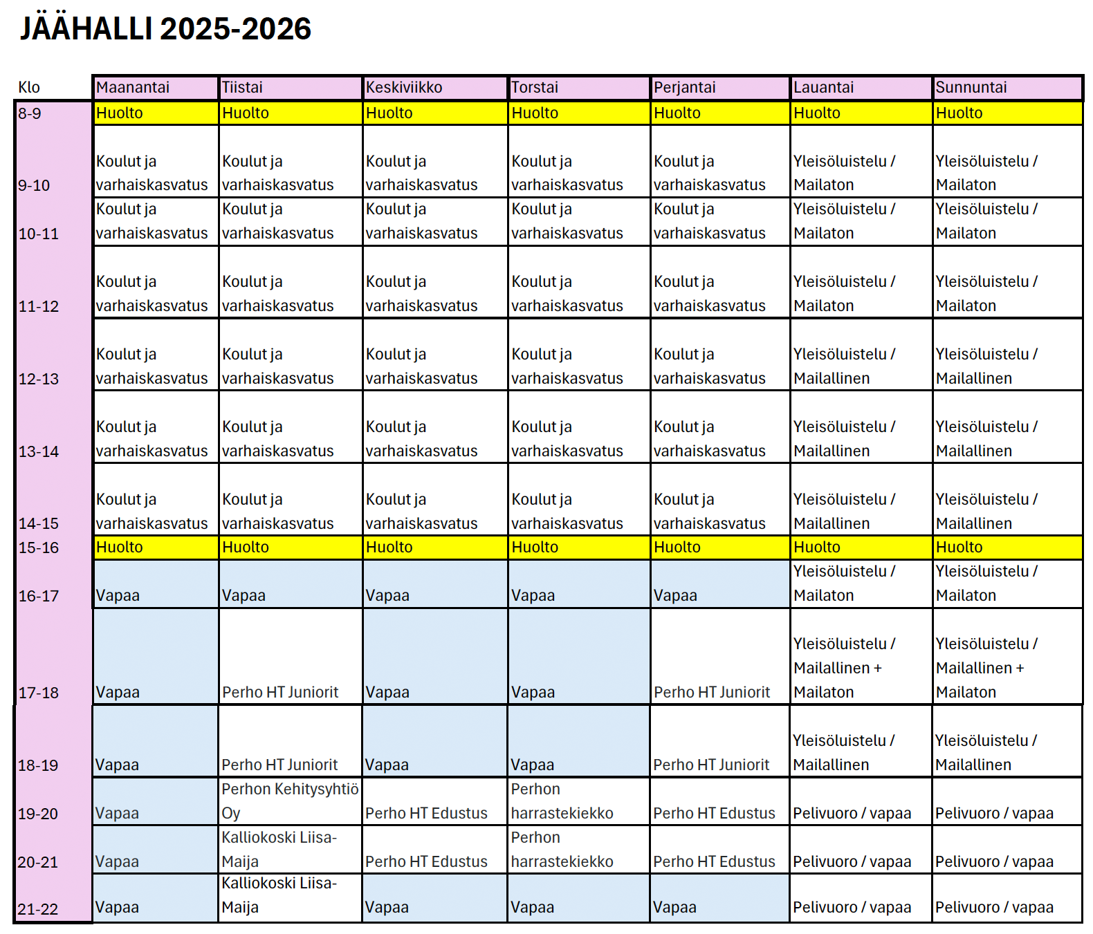 Jäähallin vakiovuorot ja käytännön asioita koskien jäähallin käyttöä